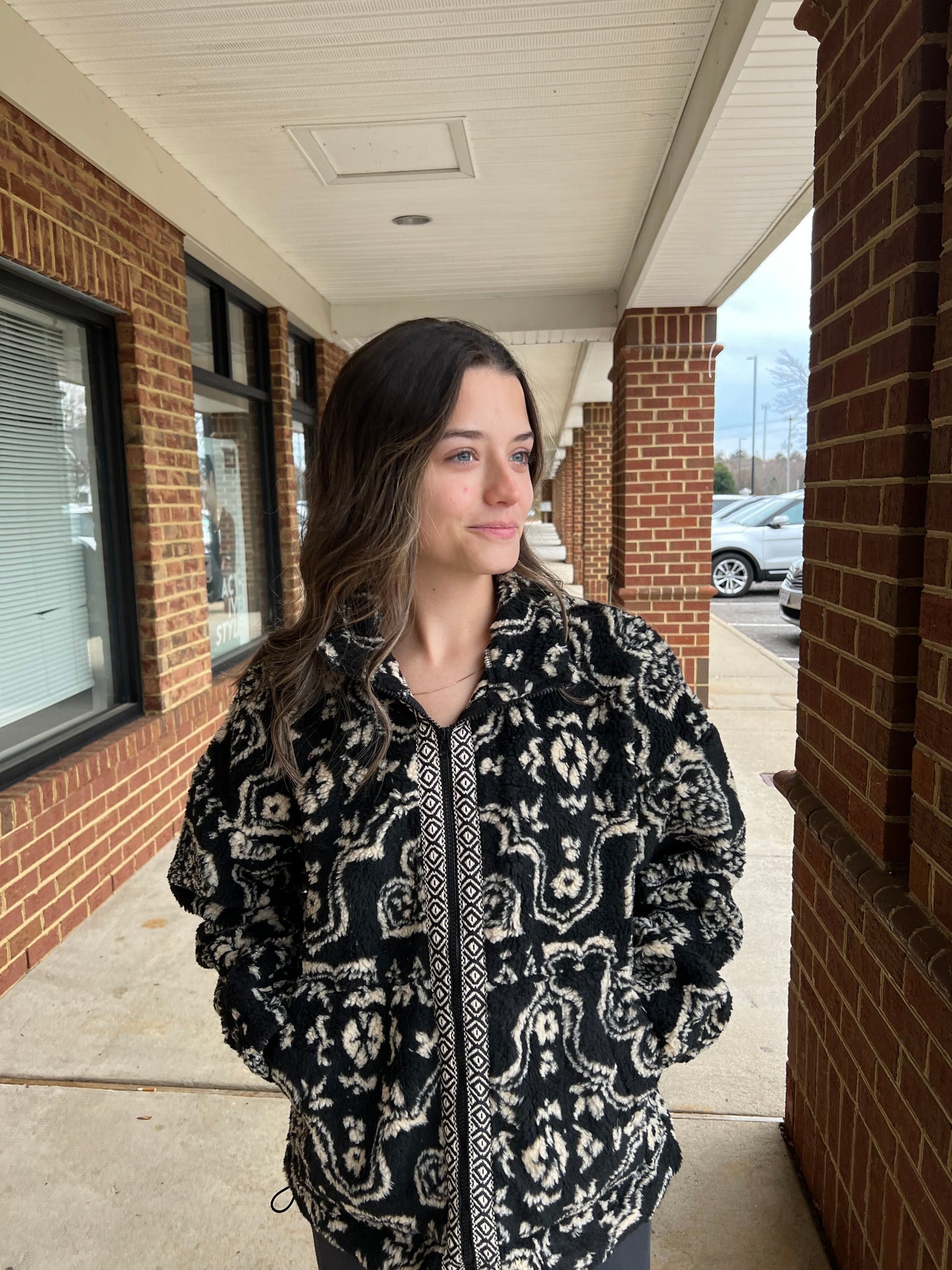 Oversized Trim Detail Printed Casual Fleece Jacket - Camo & Geometric Graphic - Sherpa - Mock Neck - Zip Up - Side Pockets - Long Sleeve - Drop Shoulder